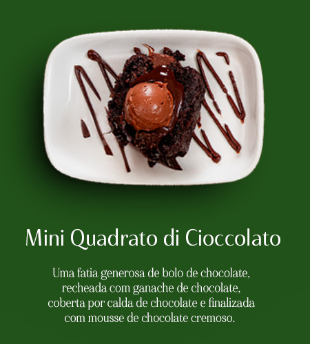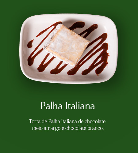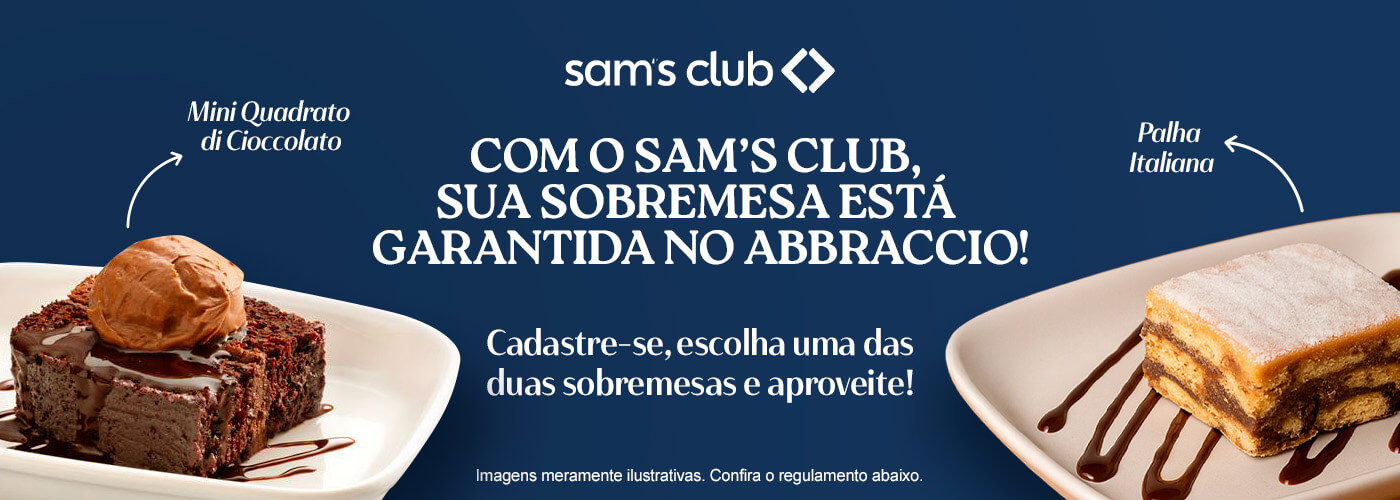 Imagens meramente ilustrativas. Ganhe uma Palha Italiana na compra de um dos pratos participantes da parceria com Sam's Club (1 Risotto de Camarão e Pancetta OU 1 Polpettone Pomodoro OU 1 Gnocchi Capri OU 1 Linguine Mediterrâneo OU 1 Spiedino di Mare) OU Mini Quadrato Di Cioccolato na compra de um dos pratos participantes da parceria com Sam's Club (1 Polpettone Pomodoro OU 1 Spiedino di Mare). O benefício está sujeito à disponibilidade de estoque. O voucher não pode ser utilizado em pedidos do Menu Almoço ou ações promocionais. Não cumulativo com campanhas. Oferta válida até 31/12/2025. Esta cortesia não pode ser trocada por outro produto nem ter o seu valor utilizado como crédito para fins de desconto, devendo ser consumida no próprio restaurante (não válido para Delivery e pedidos para viagem). *Será admitida apenas uma utilização por CPF e por mesa.