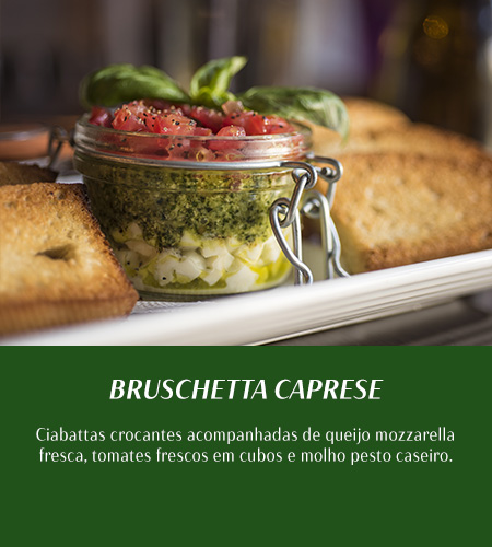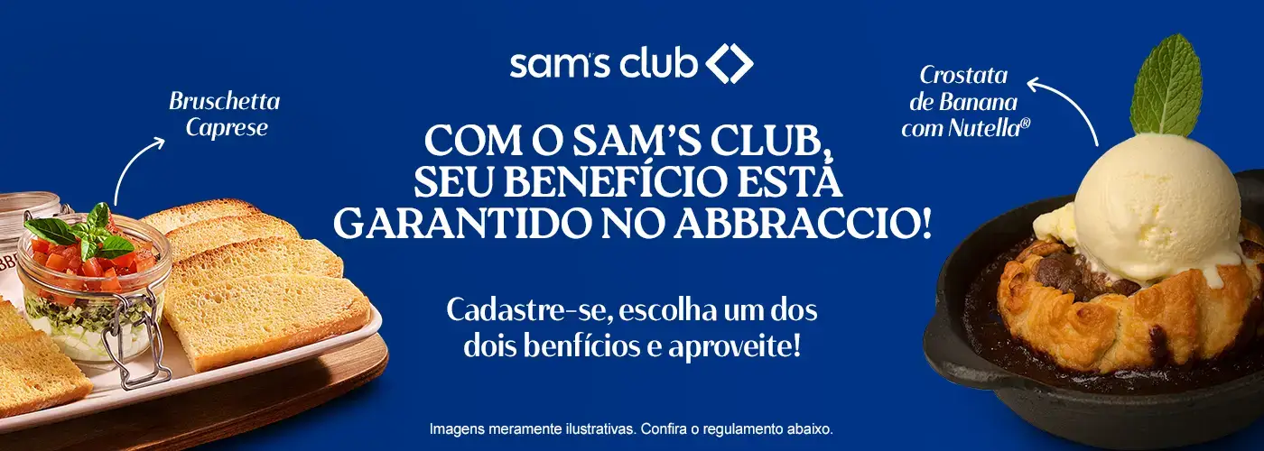 Imagens meramente ilustrativas. Ganhe uma Crostata de banana com Nutella® na compra de qualquer prato principal ou aperitivo, OU uma Bruschetta Caprese na compra de qualquer prato principal ou aperitivo, na parceria com Sam's Club. O benefício está sujeito à disponibilidade de estoque. O voucher não pode ser utilizado em pedidos do Menu Almoço ou ações promocionais. Não cumulativo com campanhas. Oferta válida até 28/02/2026. Esta cortesia não pode ser trocada por outro produto nem ter o seu valor utilizado como crédito para fins de desconto, devendo ser consumida no próprio restaurante (não válido para Delivery e pedidospara viagem). *Será admitida apenas uma utilização por CPF e por mesa.